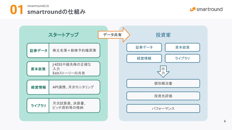 smartroundの投資家向け機能について説明しています。案件ソーシング、投資先管理、ファンド管理、LP向けレポート作成支援などの投資関連業務を効率化するサービスを紹介します。